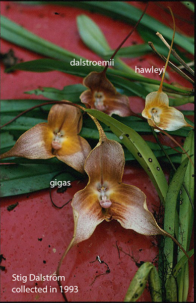 In the eighties and nineties a group of Swedish enthousiasts, with Stig Dalström amongst them, collected a large number of plants in Ecuador. Plants like Dracula alcithoë, dalessandroi, dalstroemii, felix, gigas, hirtzii, iricolor, lafleurii, levii, lindstroemii, mantissa, marsupualis, mopsus, morleyi, radiosa, rezekiana, sibundoyënsis, sodiroi, ubangina, vampira, woolwardiae. Some of the species were found by them for the first time ever.